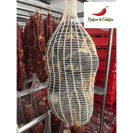 Il Capicollo Calabrese è il simbolo della norcineria d’eccellenza della nostra regione. Ricavato dal muscolo del collo del suino, un taglio pregiato che presenta una perfetta marezzatura di grasso nobile, viene lavorato con la sapienza di un tempo: salato a secco, massaggiato con cura e arricchito dal peperoncino rosso calabrese. La lenta stagionatura in budello naturale conferisce al Capicollo una consistenza compatta ma incredibilmente morbida, dove la dolcezza della carne si fonde con la nota vivace e aromatica del peperoncino, creando un equilibrio di sapori inimitabile.